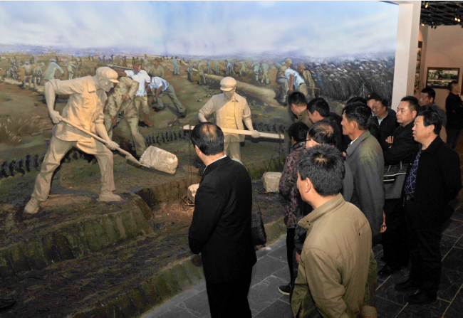 在新征程中勿忘“大鍬、扁擔(dān)”,就是要求我們要接過軍墾先輩們的精神接力棒,以腳踏實地的干勁,以舍我其誰的擔(dān)當(dāng),來為了讓更多的職工群眾能過上美好幸福生活的向往。特別是在時下廣泛開展的“不忘初心、牢記使命”的主題教育中,更需要我們深入貫徹黨的十九大精神,牢固樹立以人民為中心的思想,一切為了人民,一切依靠人民,唯有這樣,我們才能在新征程的道路上,無往而不勝。圖為客人們在農(nóng)建四師陳列館中觀看以江希友和仇泉原型創(chuàng)作的“江大鍬”和“仇大筐”雕塑模型。