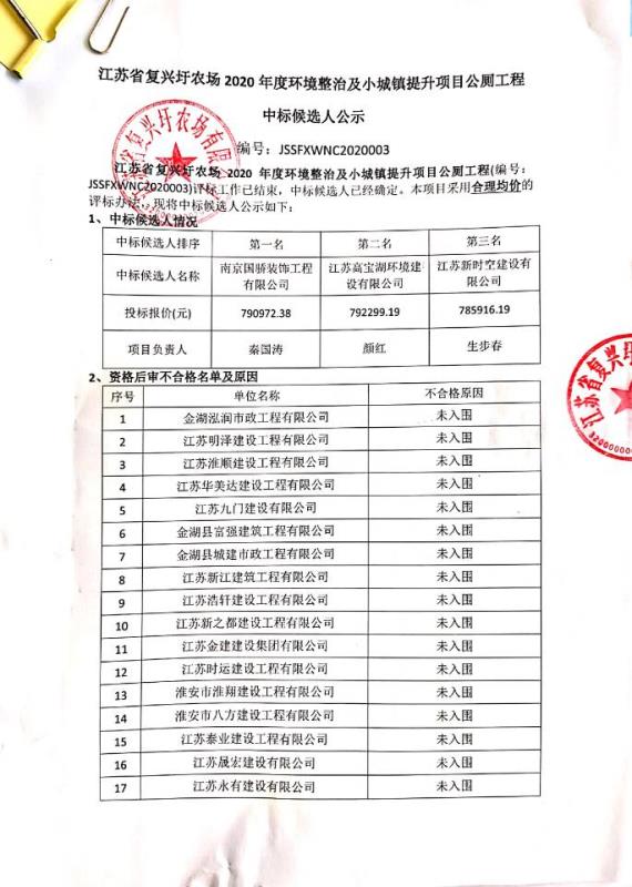 江蘇省復興圩農場2020年度環境整治及小城鎮提升項目公廁工程中標候選人公示