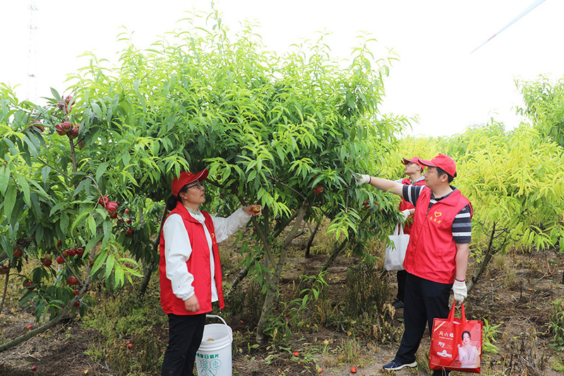 “今天來這里幫綠農園公司摘桃子,我們就是要將學黨史、辦實事落實到實際行動上。”“通過參加志愿活動,為企業發展出點力。”黨員志愿者們說。