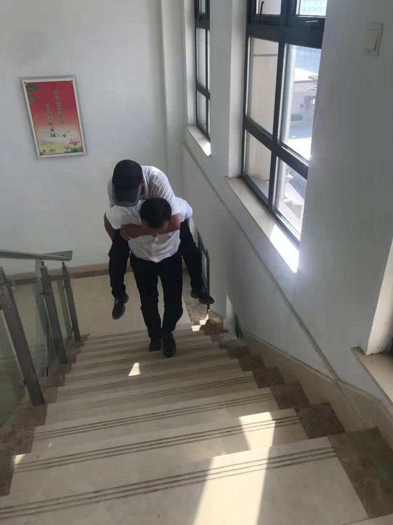 下午4時許,一位近60歲的右腿殘疾村民,滿頭大汗、步履艱難地來到社區一樓大廳,右手緊緊握著樓梯扶手,準備上至三樓進行接種。看到他蹣跚挪步時的鏡頭,大廳工作人員紛紛站立起來準備上前進行攙扶時,社區工作人員、城西黨支部副書記董偉一個健步沖了過去說:“我是共產黨員,我個大,我來背!”說完,他走到該村民身邊,蹲下身上,叫這位村民趴在他的背上,然后手托著屁股,一步一步地走上了三樓的疫苗接種室。