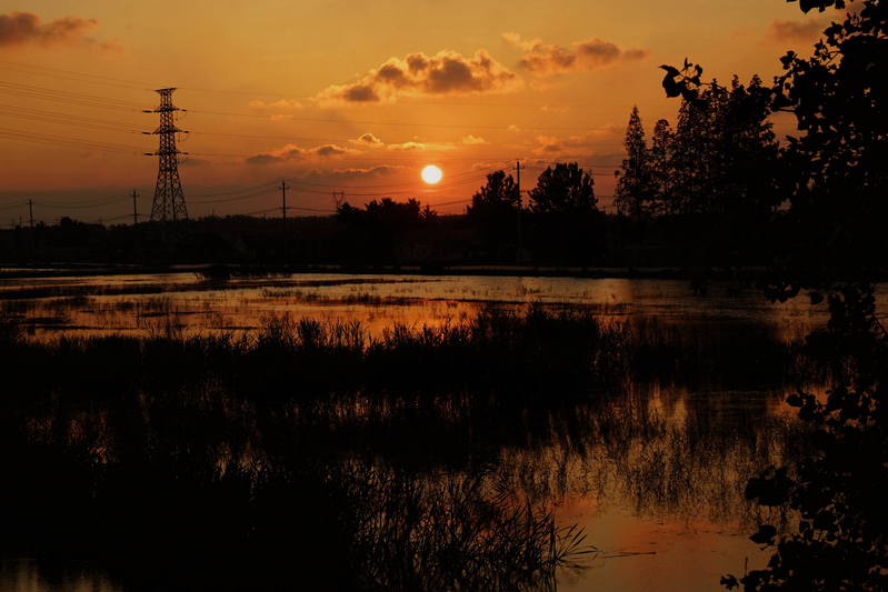 從新洋農(nóng)場(chǎng)跨過(guò)黃沙港,緊靠北岸的興橋鎮(zhèn)日新村,有一處400畝左右的魚塘,魚塘里長(zhǎng)滿蘆葦、菖蒲等水生植物,常有鳥兒飛過(guò)和棲息,野鴨也不時(shí)地在水中游弋嘻戲。這哪是魚塘,分明是一處天然的濕地,并無(wú)人工雕琢,給人以原生態(tài)感覺。遠(yuǎn)處那高高聳立的輸電鐵塔,又參和進(jìn)了人文的元素,自然景觀與人文景觀相輔相成,相得益彰。每當(dāng)夕陽(yáng)西下,云彩繚繞,晚霞飛紅之時(shí),那種剪影之美、濕潤(rùn)之美、靜謐之美,美輪美奐,令人陶醉。
