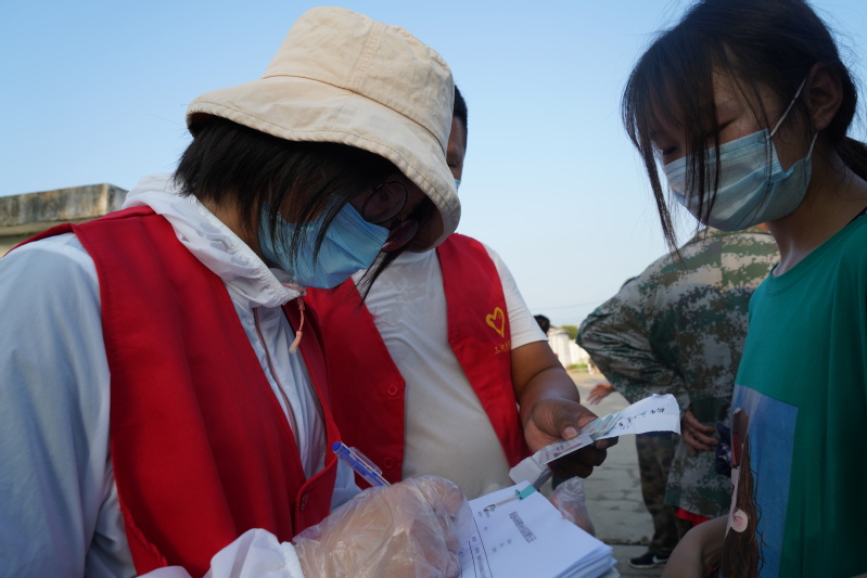 孫川頁是盱眙桂伍鎮山洪村主任、黨支部書記,疫情發生后,由于是嫁到農場,不能到單位上班滯留在了三河,在向農場捐贈了酒精、免洗消毒凝膠和100包口罩后,當她得知農場要進行全員核酸檢測的消息,便主動請求到檢測點做志愿服務,在保鮮庫核酸檢測點我們看到了孫川頁,她身穿紅色志愿者馬夾,與志愿者們一起登記填寫信息,維持現場秩序等,作為三河人的家屬,她把三河當家,全身心的投入到核酸檢測的各項服務工作,一直到核酸檢測工作全部完成。