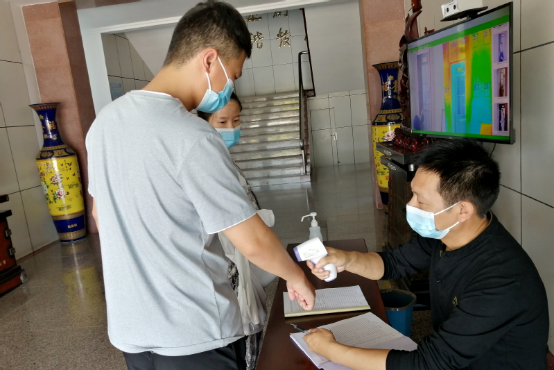 在新洋,無論是農場公司機關還是蘇墾農發新洋分公司機關,工作人員上班或是到機關辦事的外來人員一律須戴好口罩,要進行實名登記并測量體溫;無論是進入農貿市場還是到銀行等部門辦事,也同樣一律須戴好口罩,留下電話號碼并測量體溫,人人過關,一人不漏。