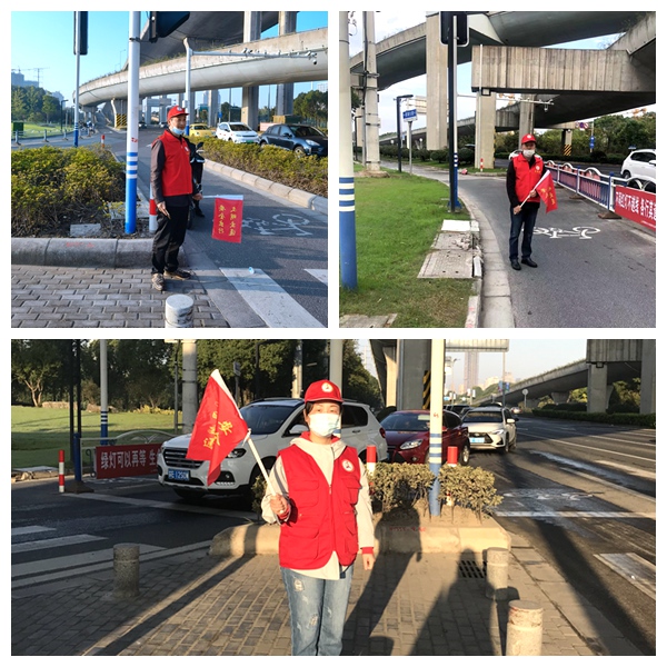 在南通市經(jīng)濟技術(shù)開發(fā)區(qū)東方大道和星湖大道路口,隊員們身穿紅色小馬夾分別站在四個路口,手執(zhí)紅色指揮旗,提醒過往行人及非機動車輛遵守交通規(guī)則,注意自身安全。微笑著勸導(dǎo)即將闖紅燈的市民,提醒他們過馬路一定要注意紅綠燈。