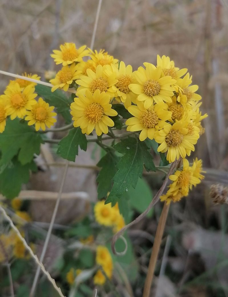和前輩到外拓基地去采風,忽然田埂上簇簇明黃躍入眼中,我驚呼出聲,再也移不開視線。多年未見的野菊花在田埂上的草叢間、蘆葦下恣意地綻放著,一株株、一簇簇隨風搖擺,星星點點,這抹明黃是瑟瑟秋天里最溫暖的色彩。