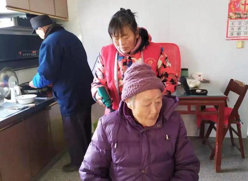 我們在金奶奶家看到,身著志愿服裝的沈善兵、張榮芳兩人,他們在麻利地為老人進行健康體檢、理療等服務,同時為老人家整理床鋪、打掃廚房、刷洗積塵等衛生服務工作,讓金奶奶老兩口開心不已之時,又感嘆著兩位志愿者的傾情服務,讓他們有了兒女在家的感覺。