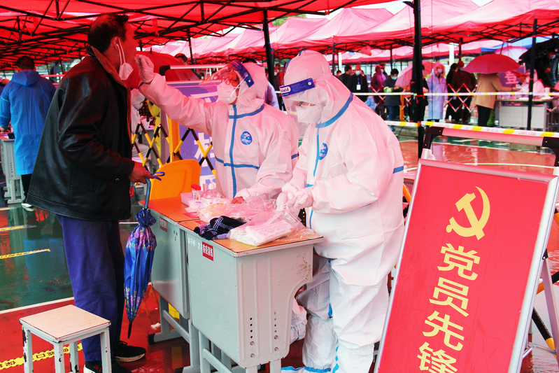 “我們是黨員,讓我們來”協(xié)助醫(yī)務(wù)人員采樣,要面對(duì)脫了口罩的人群,來自財(cái)務(wù)部門的3名女同志以特有的細(xì)心,快速高效地完成了工作任務(wù)。