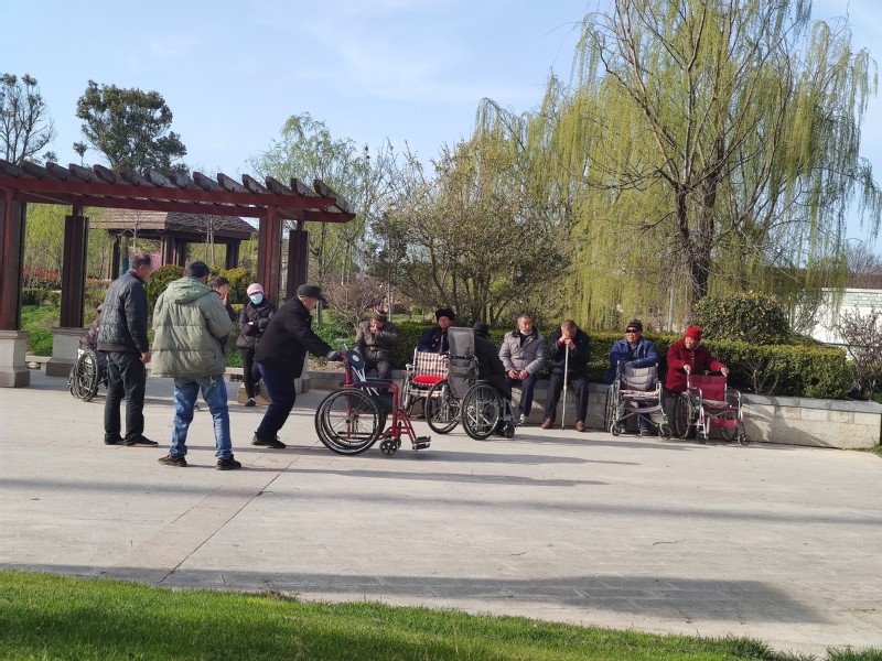 我們發(fā)現(xiàn),來這里休憩的老人中,推著輪椅來的老人特別的多,這些老人中,有自己轉(zhuǎn)著輪椅過來的,也有兒女推著他們過來的。“我爸總是讓我將他推到公園中來,他就喜歡與同齡人在一起熱鬧熱鬧,這樣他的心情才舒暢?!焙F成的兒子將老人推到公園坐椅著時對我說,“老人怎么說怎么好,我們做兒女的,滿足下他們的心愿就好了。圖為老人們在一起交談時的鏡頭。