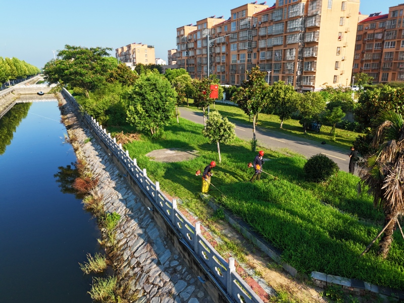 連日來,連云港市海州區加緊推進環境綜合整治工作,著力打造“河暢、水清、岸綠、景美”的優美環境。圖為8月21日,位于該區的江蘇農墾崗埠農場綠化工人在振興河畔修剪管護草坪。