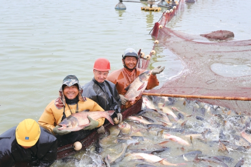 近日,江蘇省連云港市海州區(qū)的江蘇農(nóng)墾崗埠農(nóng)場,工人們在魚塘里拉網(wǎng)捕撈分揀花鰱、白鰱等水產(chǎn)品,準備發(fā)往周邊市場銷售。