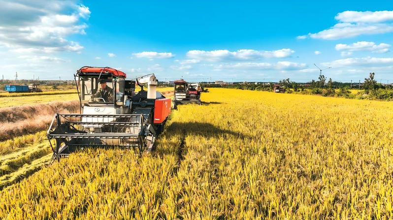 江蘇省鹽城市射陽縣,江蘇農墾新洋農場工作人員搶收水稻。張偉生攝 (人民圖片)