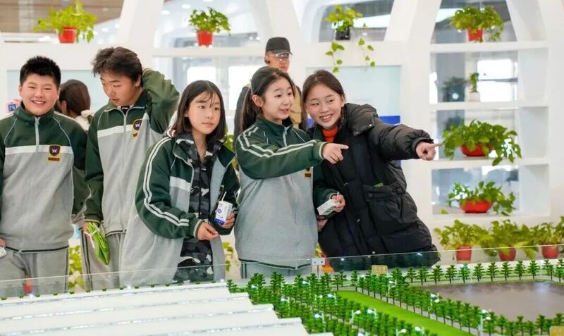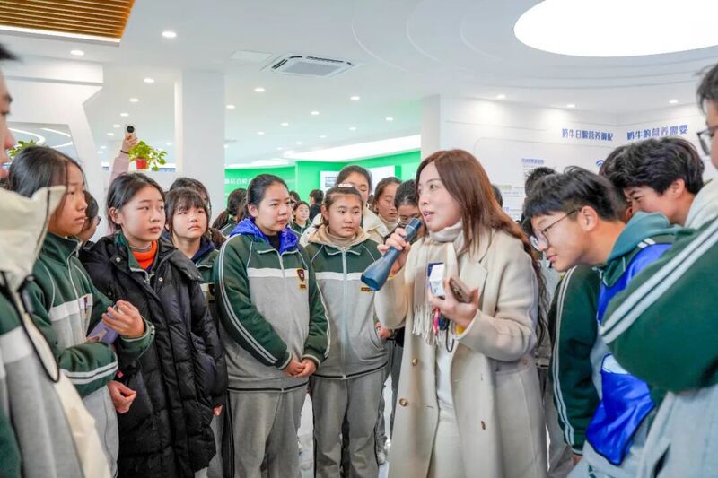 “原來奶牛是這樣擠奶的!太神奇了……”在可視化擠奶廳里,師生們的驚嘆聲此起彼伏。兩座全自動轉盤式利拉伐擠奶機正在運轉,一頭頭黑白花奶牛有序走上轉盤,擠奶員則熟練地進行著前藥浴、驗奶、套杯、后藥浴等標準化操作,整個流程清晰直觀地呈現在眾人眼前。“老師,這些奶牛每天能產多少奶呀?”一名戴眼鏡的男生舉手提問。講解員小張笑著解答:“一頭牛最高可以產70公斤牛奶,產出的牛奶都要經過100多項指標檢測,達標合格后才能走向市場。”在智慧化生態展廳,師生們既能通過圖文展板系統學習奶牛品種特性、科學飼養方法及飼料配方等基礎知識,又能通過蘇墾乳業數字牧場展示平臺實時查看每頭奶牛的身份檔案、生長曲線、產奶數據及健康監測指標,沉浸式感受科技為傳統養殖業帶來的變革。“這次研學真是讓我親眼看到了科技養牛的力量,原來一杯好牛奶的誕生背后,藏著這么多學問!”一位帶隊老師感慨道。