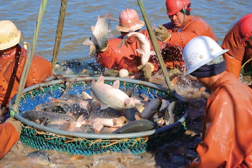 隨著2026年元旦臨近,水產(chǎn)市場需求量逐漸增大,江蘇省連云港市海州區(qū)積極做好鮮魚捕撈銷售工作,切實(shí)滿足節(jié)日市場需求。圖為海州區(qū)的江蘇農(nóng)墾崗埠農(nóng)場加緊拉網(wǎng)捕撈鯉魚、花鰱、白鰱等各種鮮魚,準(zhǔn)備供應(yīng)云南昆明、山東濟(jì)寧等多地市場。  徐衛(wèi) 攝