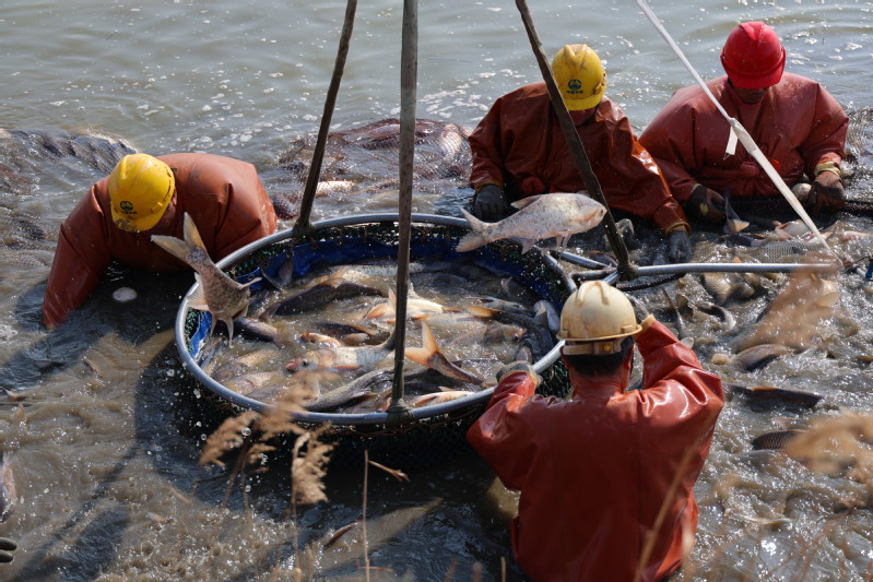 近期,崗埠農場小島山養殖基地迎來鮮魚豐收季。千畝水產養殖基地上一片繁忙景象,十余名捕魚工人正緊密配合,熟練地進行著拉網作業,一條條鮮活的鯉魚、鰱魚紛紛躍出水面,水花不斷翻騰,奏響了冬日的豐收樂章。
