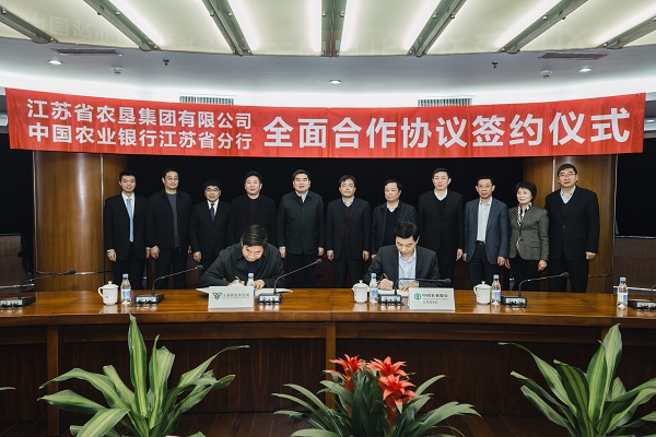 1月9日上午,集團公司與中國農業銀行江蘇省分行簽署全面合作協議。集團公司黨委書記、董事長魏紅軍、總經理胡兆輝、黨委委員、蘇墾農發公司總裁蘇志富,江蘇農行黨委書記、行長張建良、副行長周吉、程國新出席簽約