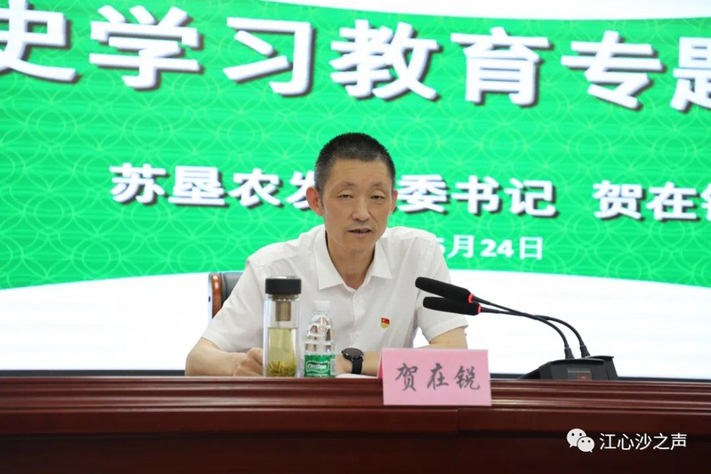 賀在銳分別從深入學習領會習近平總書記關于黨的歷史的重要論述,充分認識開展黨史學習教育的重大意義;認真研讀黨史基本著作,全面了解中國共產(chǎn)黨百年奮斗的光輝歷程和歷史性成就;深刻把握開展黨史學習教育的重點,扎實做好“六個進一步”;開展黨史學習教育,要學懂弄通做實習近平新時代中國特色社會主義思想,增強“四個意識”,堅定“四個自信”,做到“兩個維護”等方面,對黨史學習教育的重要意義、重要方法、重點工作作了概述,解讀了中國共產(chǎn)黨的百年光輝歷程,并結合蘇墾農(nóng)發(fā)和江心沙發(fā)展實際探析了在當前國際環(huán)境、國內(nèi)條件下的高質(zhì)量發(fā)展之路。