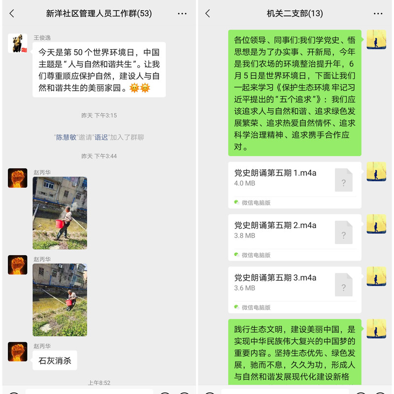 機(jī)關(guān)二支部則把黨史教育與環(huán)境整治相結(jié)合,通過支部黨史朗誦專題學(xué)習(xí)《保護(hù)生態(tài)環(huán)境牢記習(xí)近平提出的“五個(gè)追求”》,要求大家在農(nóng)場(chǎng)公司黨委的領(lǐng)導(dǎo)下,追求人與自然和諧、追求綠色發(fā)展繁榮、追求熱愛自然情懷、追求科學(xué)治理精神、追求攜手合作應(yīng)對(duì),堅(jiān)持生態(tài)優(yōu)先、綠色發(fā)展,馳而不息,久久為功,以更美的環(huán)境面貌慶祝建黨百年、迎接建場(chǎng)70周年。