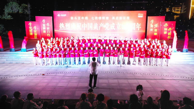 晚會(huì)由150人組成的鑼鼓隊(duì)和健走隊(duì)巡游拉開(kāi)帷幕,隊(duì)員們身著統(tǒng)一服裝,手舉黨旗、國(guó)旗從云荷廣場(chǎng)出發(fā)至東山路再到普山路。現(xiàn)場(chǎng)近百人的威風(fēng)鑼鼓氣勢(shì)磅礴,社區(qū)領(lǐng)導(dǎo)上臺(tái)致辭后,演出活動(dòng)在歡快的非洲鼓《中國(guó)范》表演中正式開(kāi)始。舞蹈《一杯美酒》《亞麗古娜》抒發(fā)了人們對(duì)新生活的追求與渴望;詩(shī)朗誦《我驕傲我是中國(guó)人》《少年中國(guó)說(shuō)》《我愛(ài)你,中國(guó)》表達(dá)做為一名中國(guó)人驕傲和自豪,已經(jīng)深深植根于每個(gè)中國(guó)人的心中,表達(dá)了對(duì)革命前輩的崇敬和對(duì)祖國(guó)的熱愛(ài);男聲獨(dú)唱《我和我的祖國(guó)》用無(wú)限的深情表達(dá)了同祖國(guó)共命運(yùn)、心連心,祖國(guó)是我們億萬(wàn)炎黃子孫生命的寄托之情;演講《百年征程史不忘初心路》則講述的是本場(chǎng)老革命、老黨員闞立仁同志在朝鮮戰(zhàn)場(chǎng)上的真實(shí)故事,感人至深,表達(dá)了對(duì)革命前輩的崇敬,讓現(xiàn)場(chǎng)黨員群眾以“沉浸式”感受此次文藝演出帶來(lái)的精神洗禮。快板表演唱《美麗云臺(tái)》、建黨百年表演唱《少年》等一系列節(jié)目輪番上演,精彩紛呈;社區(qū)工作人員用恢弘磅礴的氣勢(shì)合唱《保衛(wèi)黃河》,飽含深情,感受我黨從槍林彈雨和日寇的封鎖線走來(lái),我們伴著歌聲奮勇殺敵的場(chǎng)景歷歷在目,表達(dá)了對(duì)中國(guó)共產(chǎn)黨成立100周年的深深祝福。演出在居民百人激情大合唱《大海航行靠舵手》《沒(méi)有共產(chǎn)黨就沒(méi)有新中國(guó)》的歌聲中推向最高潮,表達(dá)對(duì)祖國(guó)的熱愛(ài)與祝福。