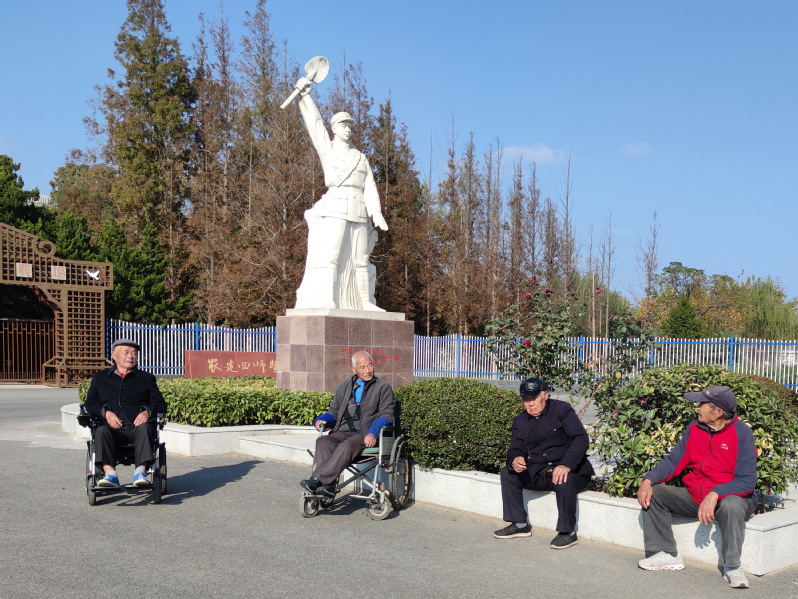 不斷前行的淮海人,扎實(shí)開展黨史學(xué)習(xí)教育,大力弘揚(yáng)軍墾精神,積極宣傳農(nóng)建四師先進(jìn)模范,用榜樣的力量感召人、鼓舞人、塑造人。農(nóng)場(chǎng)黨委開展“一個(gè)黨員就是一面旗幟”“黨員與職工結(jié)對(duì)”“黨員責(zé)任區(qū)”活動(dòng),并結(jié)合黨務(wù)公開試點(diǎn)工作和創(chuàng)先爭(zhēng)優(yōu),創(chuàng)建學(xué)習(xí)型、服務(wù)型、創(chuàng)新型黨組織等活動(dòng),加強(qiáng)農(nóng)場(chǎng)黨建工作。黨史學(xué)習(xí)教育開展以來(lái),淮海農(nóng)場(chǎng)充分利用農(nóng)建四師陳列館這一紅色實(shí)境教育基地和健在老軍墾“活化石”的功能,讓軍墾傳統(tǒng)不斷發(fā)揚(yáng)光大。長(zhǎng)長(zhǎng)的黨史學(xué)習(xí)教育清單中,農(nóng)場(chǎng)黨委除常規(guī)固定動(dòng)作外,還在黨員干部和青年員工中采取征集黨史知識(shí)試題,開展黨史知識(shí)競(jìng)賽、征文等形式,將系列活動(dòng)與黨史學(xué)習(xí)教育深度融合,并切實(shí)解決職工居民的所需、所急、所難,以更好地把廣大職工居民緊密團(tuán)結(jié)在黨的周圍,為企業(yè)改革發(fā)展貢獻(xiàn)力量。圖為農(nóng)場(chǎng)老軍工在為學(xué)生說(shuō)傳統(tǒng)和健在的老軍墾坐在雕像前回憶曾經(jīng)的風(fēng)花雪月。
