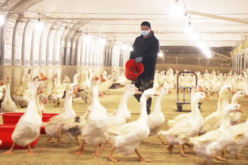 在臨海農場種鵝養殖基地的鵝棚內,青年養殖人員正專心進行喂食、撿蛋工作。
