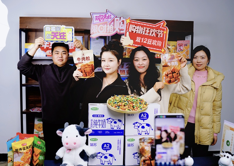 12月12日,蘇墾乳業巧妙打出“乳制品+肉制零食”營銷組合拳,以A2β-酪蛋白原生高鈣純牛奶搭配新品牛肉粒超值組合為核心產品,實現4小時直播近萬人圍觀、點贊破11萬、銷售額破10萬的亮眼成績。圖為蘇墾乳業青年直播團隊。
